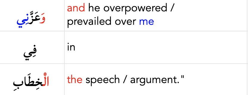 The Arabic that is translated as “to pressure me.” is وَعَزَّنِي فِي الْخِطَابِ (waʿazzanī fi l-khiṭābi), the literal meaning of this verse is “and he overpowered/prevailed me in the speech/argument.” Notice this uses the same word, الْخِطَابِ / l-khiṭābi, as described as a quality that God bestowed upon David in the previous verse. So not only does the brother have way more wealth than he has, but he also appears to be prevailing over him in his argument.