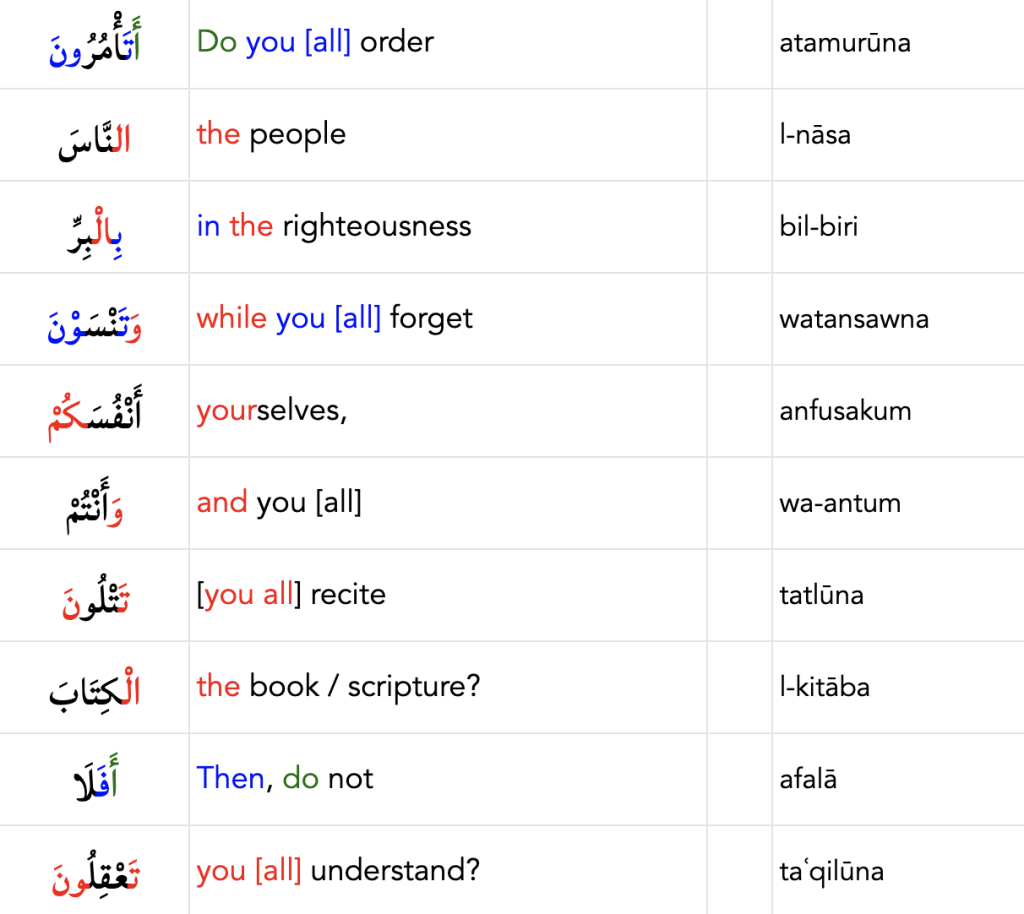 (٤٤) أَتَأْمُرُونَ النَّاسَ بِالْبِرِّ وَتَنْسَوْنَ أَنْفُسَكُمْ وَأَنْتُمْ تَتْلُونَ الْكِتَابَ أَفَلَا تَعْقِلُونَ