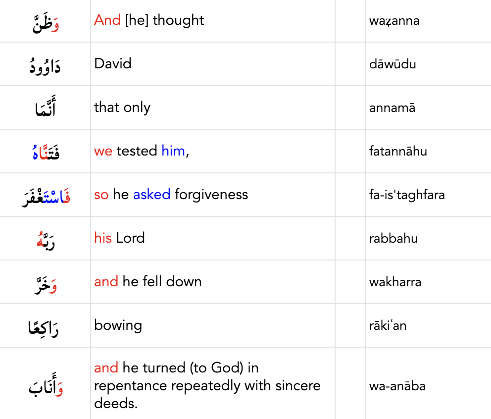 وَظَنَّ دَاوُودُ أَنَّمَا فَتَنَّاهُ فَاسْتَغْفَرَ رَبَّهُ وَخَرَّ رَاكِعًا وَأَنَابَ