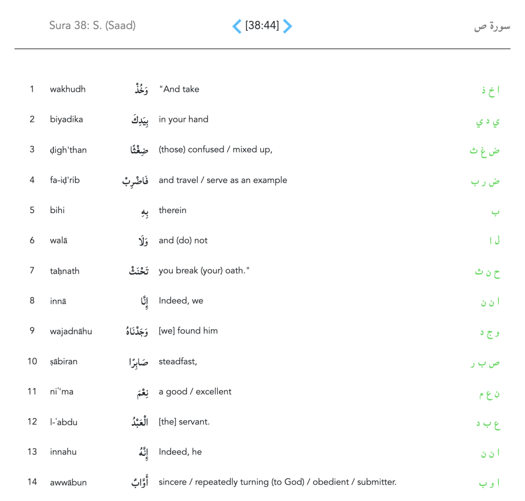 A more serious example in the Quran can be seen in 38:44, in the context of the prophet Job. Here is a sample of how most translators have translated this verse: