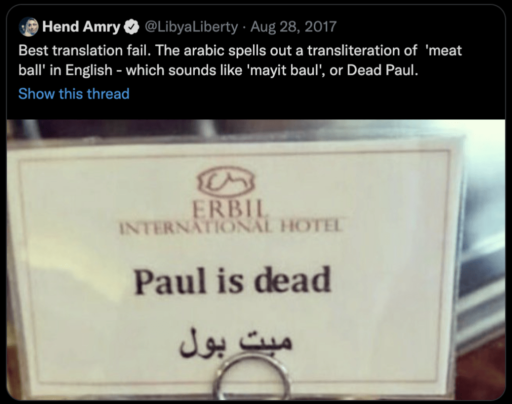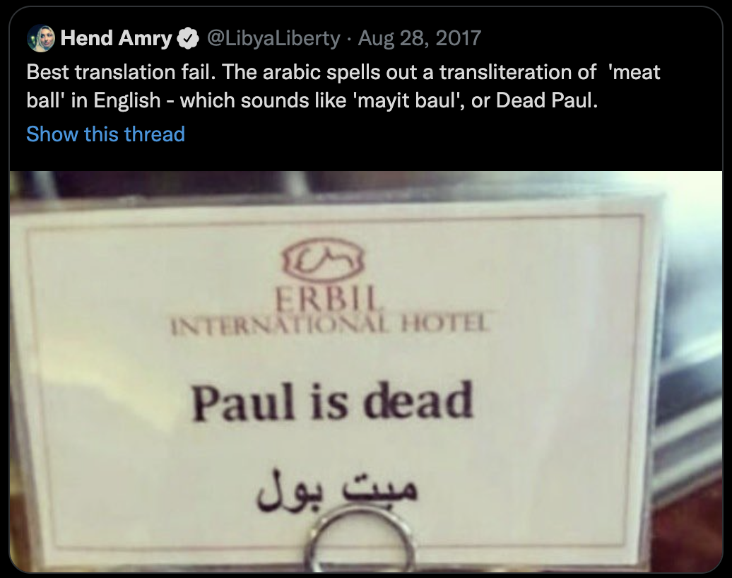 In Arabic there isn’t a letter that has the sound found in the English letter P, so instead any words that have this sound are often replaced with the Arabic letter ب which make a B sound. So in the below example for the word meat ball, rather than providing a literal translation this label provided a phonetic translation which carried the literal meaning of Paul is Dead.