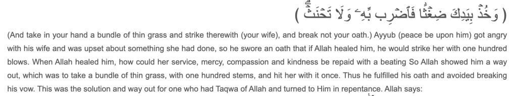 The common tafsir regarding this verse makes Job out as tyrant. Writers of tafsir believed that Job promised to beat his wife if he was to have his health restored. Then upon his health being restored he regretted his oath, so was instructed by God to beat his wife with grass as not to inflict serious harm upon her and maintain his oath. This false history was fabricated to justify the misunderstanding of this verse.