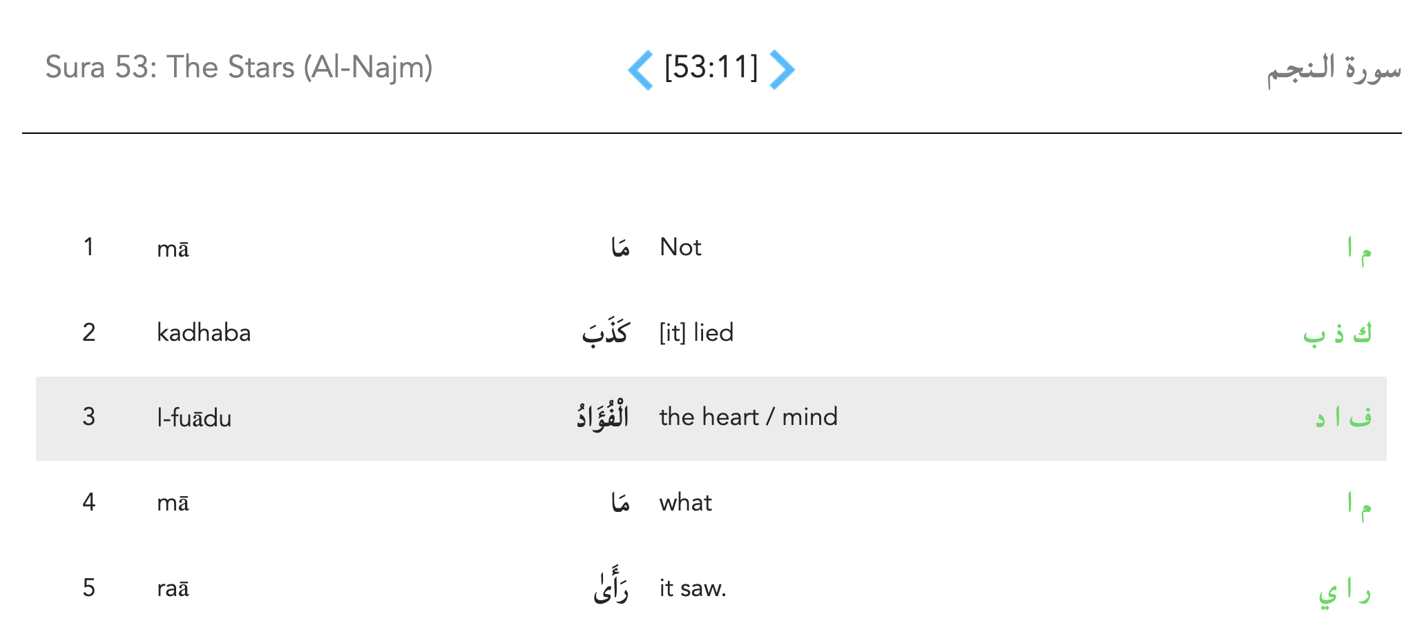 The other word in the Quran that can signify both the heart and mind is the word فاد (fawd). In Sura 53, when it discusses the ascension of prophet Muhammad’s soul to receive the Quran it makes the following statement in verse 11.