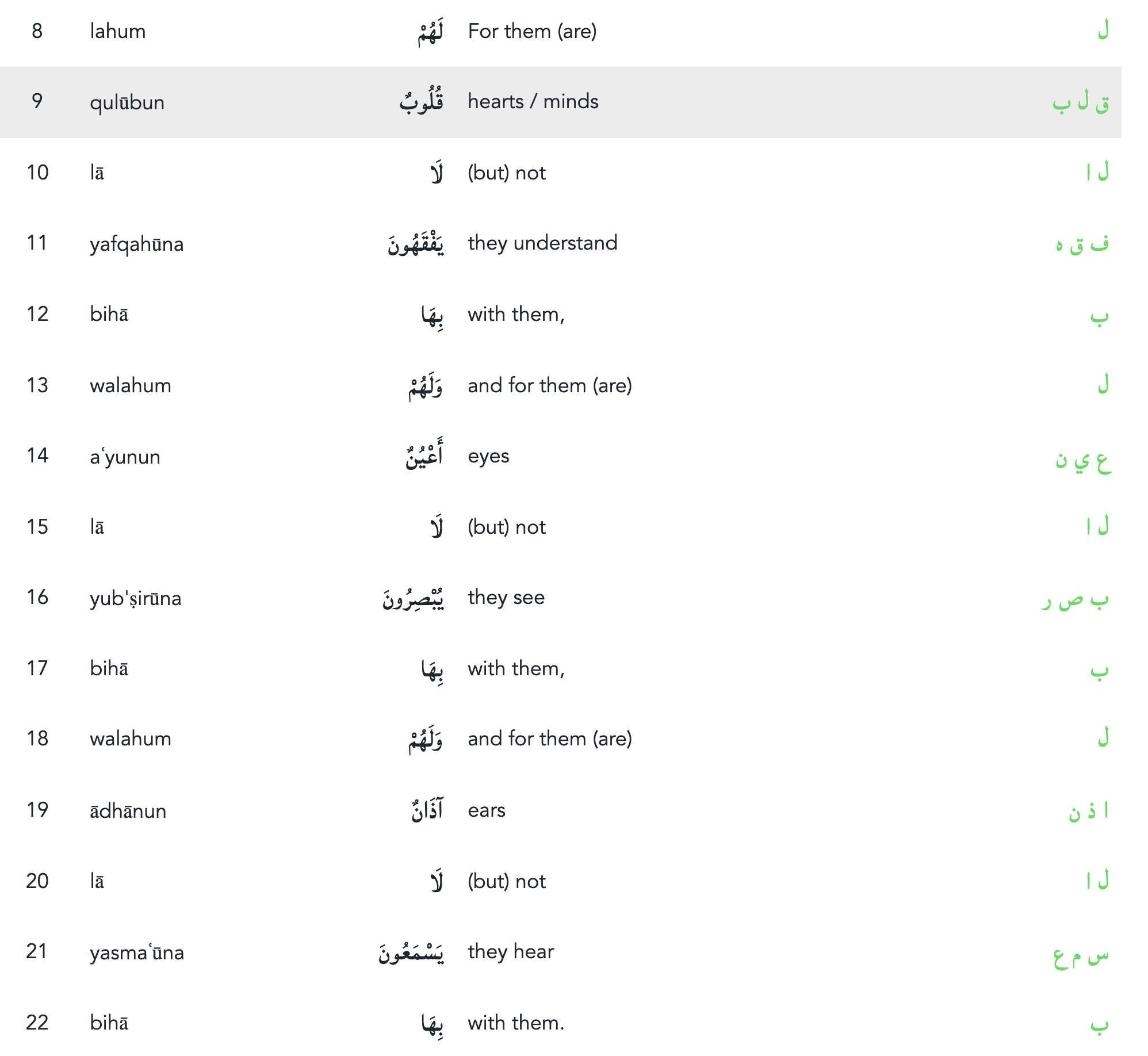 وَلَقَدْ ذَرَأْنَا لِجَهَنَّمَ كَثِيرًا مِنَ الْجِنِّ وَالْإِنْسِ لَهُمْ قُلُوبٌ لَا يَفْقَهُونَ بِهَا وَلَهُمْ أَعْيُنٌ لَا يُبْصِرُونَ بِهَا وَلَهُمْ آذَانٌ لَا يَسْمَعُونَ بِهَا أُولَٰئِكَ كَالْأَنْعَامِ بَلْ هُمْ أَضَلُّ أُولَٰئِكَ هُمُ الْغَافِلُونَ