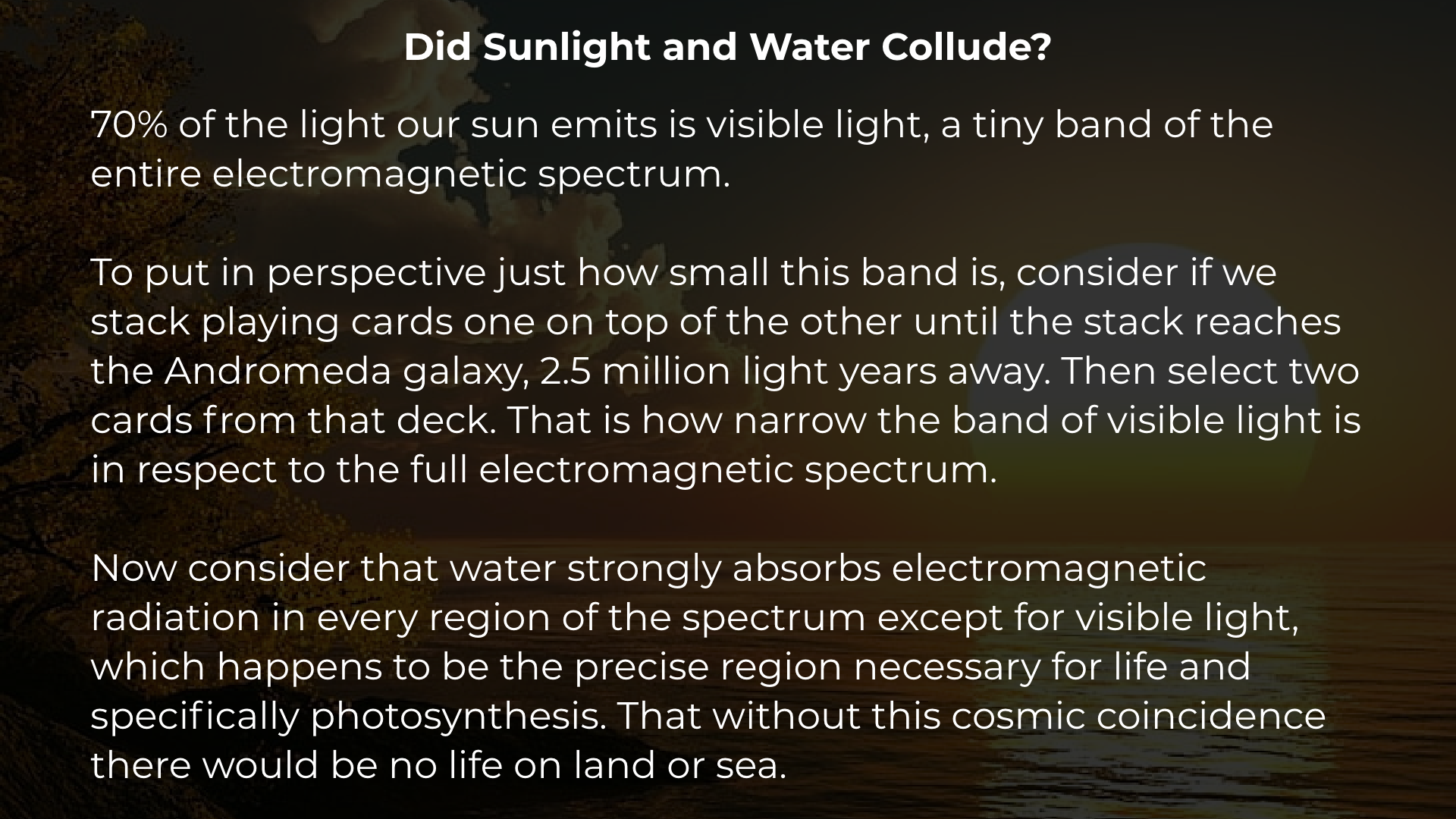 So imagine you needed to access a safe inside a hotel room except to enter the room and access the safe you would need to select the right key in two piles that are each 2.5 million light-years tall for each lock, one for the hotel room the other for the safe. Hopefully, this demonstrates just how absolutely mind-boggling these two coincidences are, that both water absorbs predominately all wavelengths of light except visible light and that our sun emits predominately visible light. Without either of these independent properties perfectly aligning, there would be no life.
