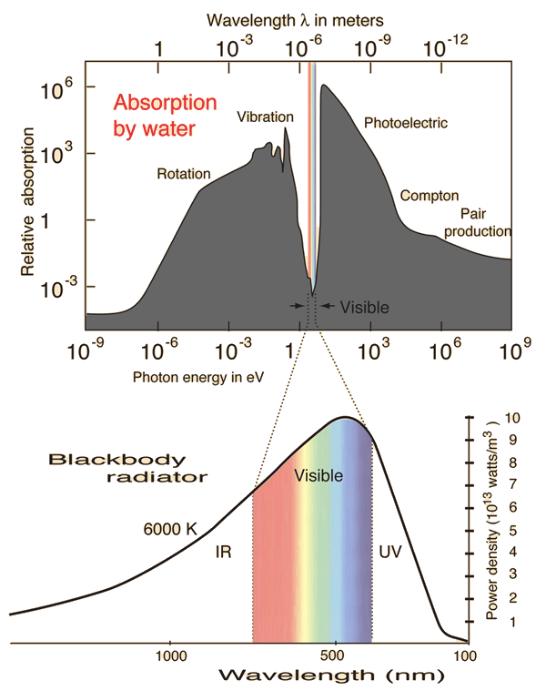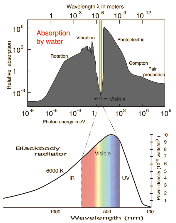 But one other aspect of water that is truly amazing is how it interacts with the electromagnetic light spectrum. The electromagnetic light spectrum can range from gamma rays which have wavelengths that are 10^-14 to radio waves which can have wavelengths that are kilometers long. It just happens that water absorbs almost all the light spectrum except for a narrow band called “visible light” which are light wavelengths of 380nm – 780nm. So all other light spectrums are blocked except for this narrow band of light.