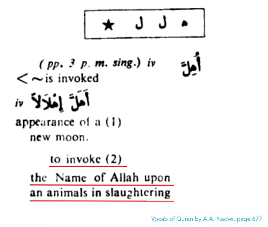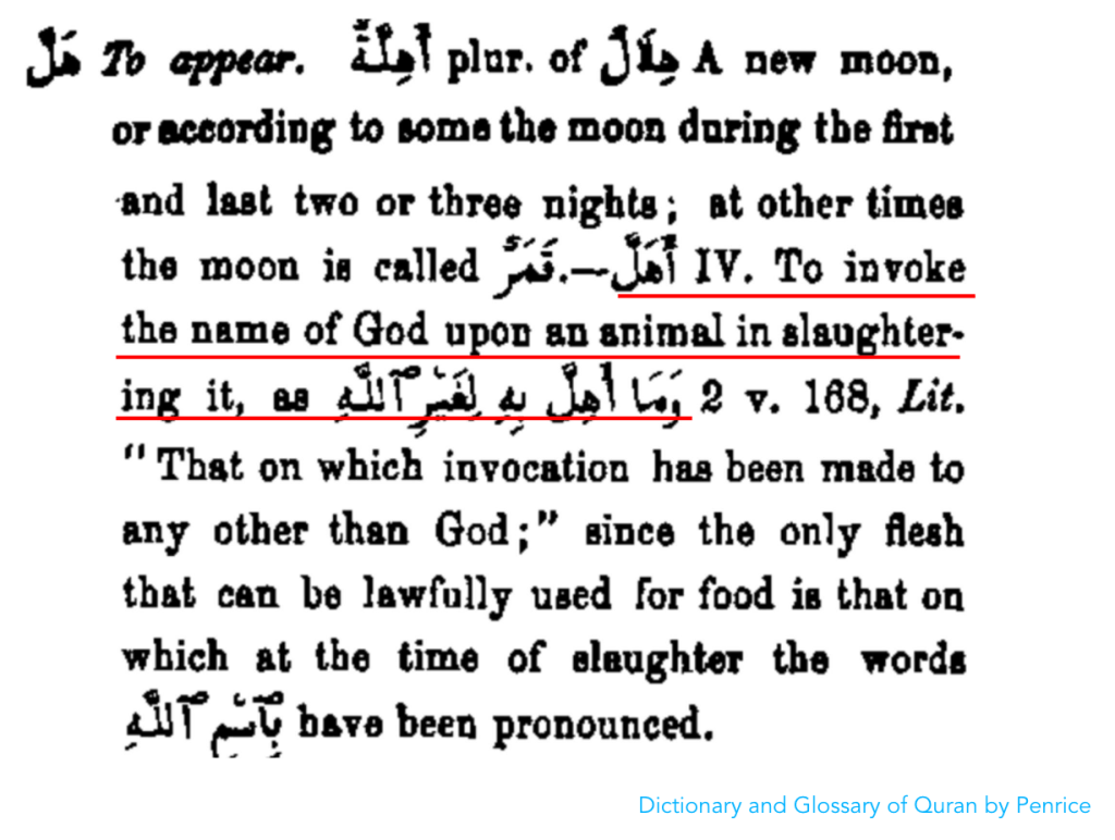 Now there is some debate regarding the fourth dietary prohibition and if it can include non-animal products. The confusion for this line of reasoning is that some translations in regards to the fourth dietary prohibition simply state “that which is dedicated to other than God.” The misunderstanding occurs because in English the word “dedicate” has a wider meaning than the Arabic word uhilla أُهِلَّ which this word is translated from. In English, one can dedicate a book, song, boat, or dish to anyone, but this goes beyond what the word uhilla أُهِلَّ means in Classical Arabic.