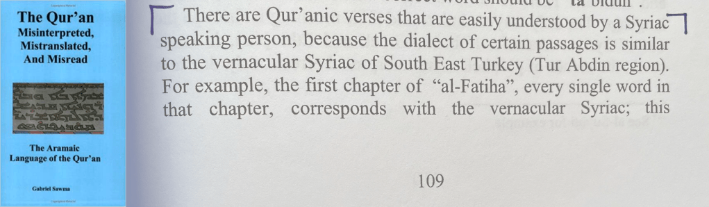 “There are Qur’anic verses that are easily understood by a Syriac speaking person, because the dialect of certain passages is similar to the vernacular Syriac of South East Turkey (Tur Abdin region). For example, the first chapter of “al-Fatiha”, every single word in that chapter, corresponds with the vernacular Syriac;”