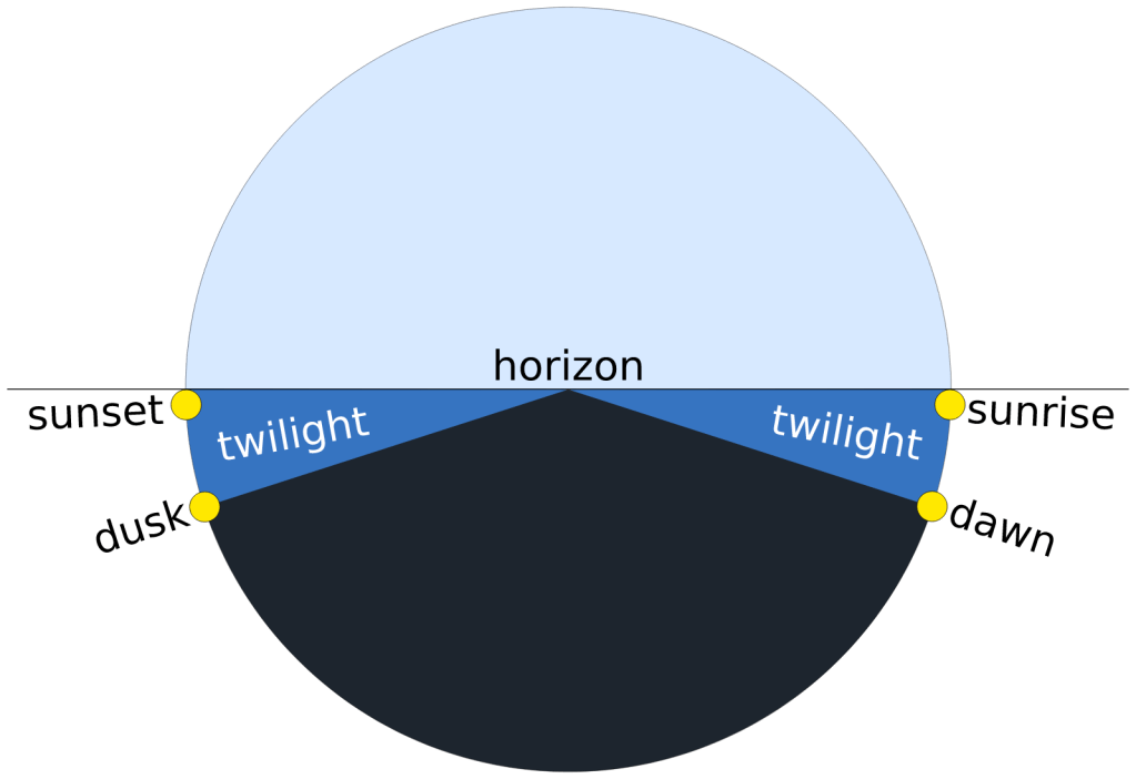 To understand the point of transition between night and day it is worth considering the words sunset from the Quran. The specific word “sunset” never actually occurs in the Quran. The common word الْمَغْرِبِ / l-maghribi that is commonly associated with sunset actually has the literal meaning of the “place of setting” or “the west” in the Quran as opposed to sunset (2:115, 2:142, 2:177, 2:258, 7:137, 18:86, 26:28, 55:17, 70:40, 73:9). Instead the expression used in the Quran is “its setting” or “the setting” in place of sunset (20:130, 50:39, 18:86).