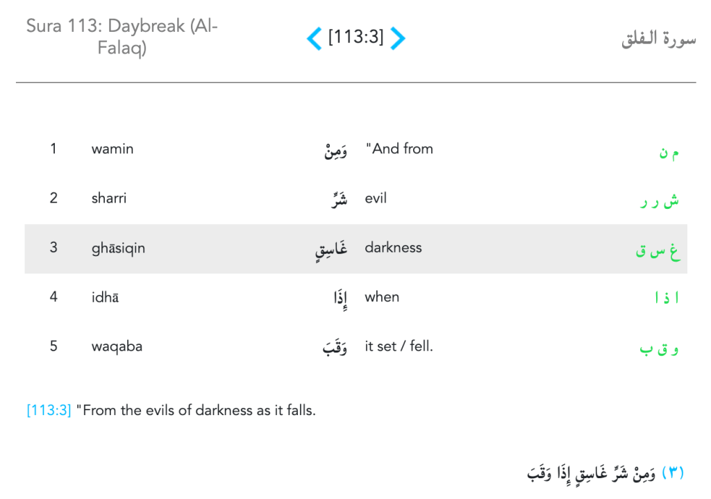 | 17 | 78 | 6 | غَسَقِ | (the) darkness / obscuring (of) | ghasaqi |