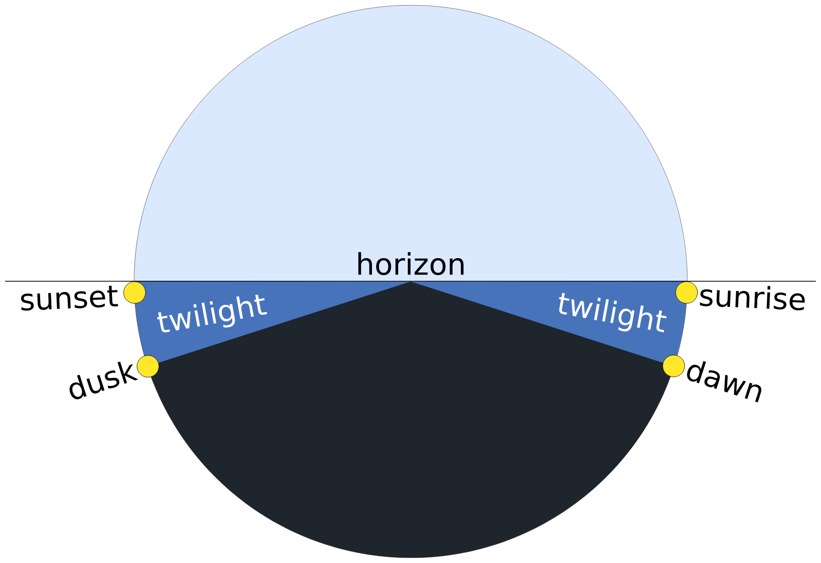 To understand the point of transition between night and day it is worth considering the words sunset from the Quran. The specific word “sunset” never actually occurs in the Quran. The common word الْمَغْرِبِ / l-maghribi that is commonly associated with sunset actually has the literal meaning of the “place of setting” or “the west” in the Quran as opposed to sunset (2:115, 2:142, 2:177, 2:258, 7:137, 18:86, 26:28, 55:17, 70:40, 73:9). Instead the expression used in the Quran is “its setting” or “the setting” in place of sunset (20:130, 50:39, 18:86).