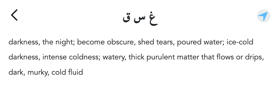 | 17 | 78 | 6 | غَسَقِ | (the) darkness / obscuring (of) | ghasaqi |