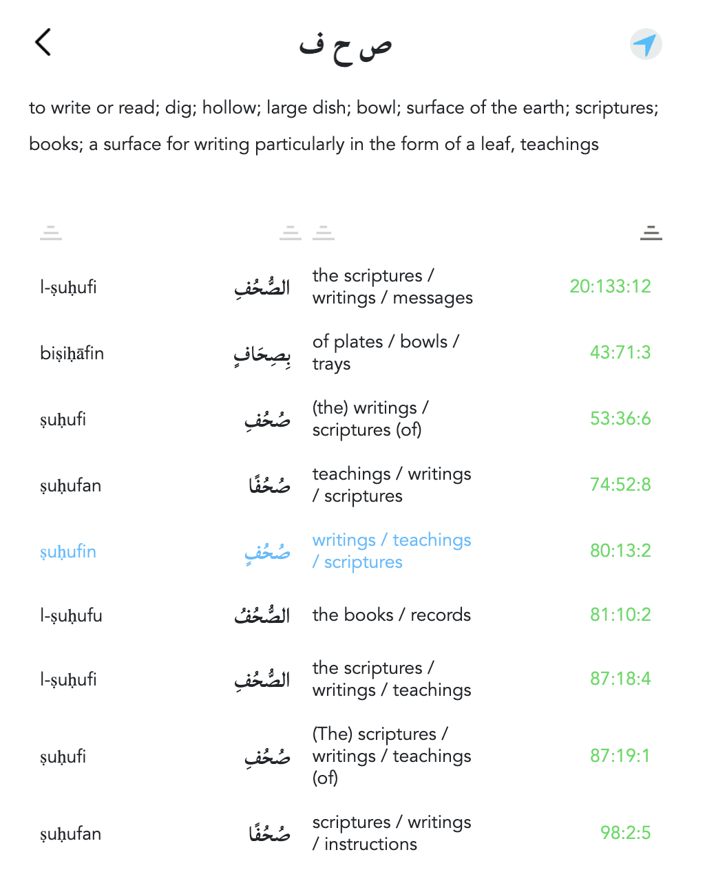 The root ص ح ف is used nine times in the Quran and has the following derivative meanings.