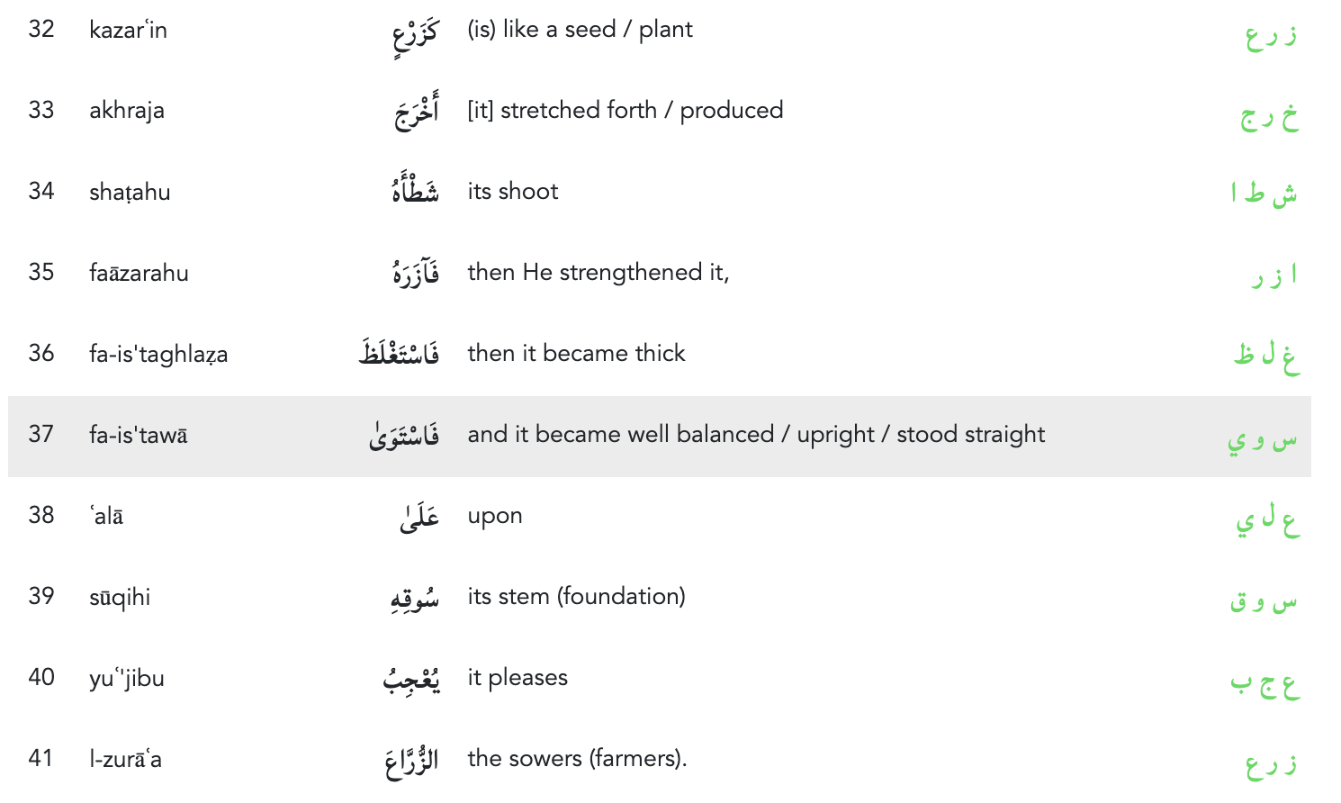 مُحَمَّدٌ رَسُولُ اللَّهِ وَالَّذِينَ مَعَهُ أَشِدَّاءُ عَلَى الْكُفَّارِ رُحَمَاءُ بَيْنَهُمْ تَرَاهُمْ رُكَّعًا سُجَّدًا يَبْتَغُونَ فَضْلًا مِنَ اللَّهِ وَرِضْوَانًا سِيمَاهُمْ فِي وُجُوهِهِمْ مِنْ أَثَرِ السُّجُودِ ذَٰلِكَ مَثَلُهُمْ فِي التَّوْرَاةِ وَمَثَلُهُمْ فِي الْإِنْجِيلِ كَزَرْعٍ أَخْرَجَ شَطْأَهُ فَآزَرَهُ فَاسْتَغْلَظَ فَاسْتَوَىٰ عَلَىٰ سُوقِهِ يُعْجِبُ الزُّرَّاعَ لِيَغِيظَ بِهِمُ الْكُفَّارَ وَعَدَ اللَّهُ الَّذِينَ آمَنُوا وَعَمِلُوا الصَّالِحَاتِ مِنْهُمْ مَغْفِرَةً وَأَجْرًا عَظِيمًا