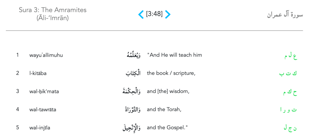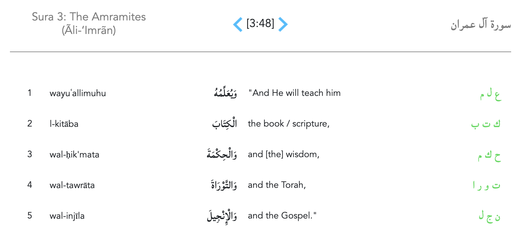 [3:48] He will teach him the scripture, and the wisdom, and the Torah, and the Gospel.