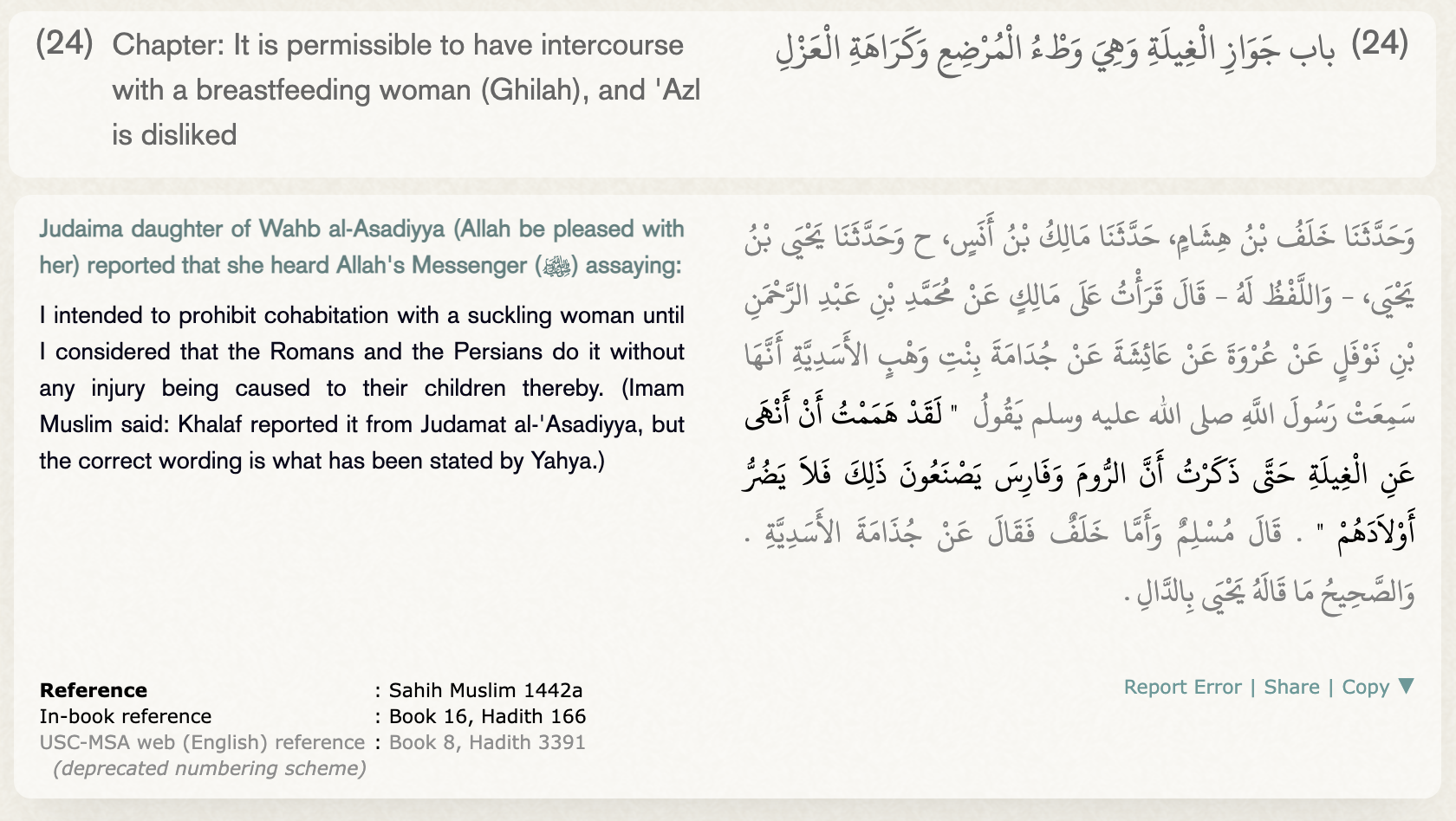 There is another peculiarity. From verses 66:4-5, it is clear that the one wife who heard the Hadith shared this information with another wife who did not hear the Hadith, and God does not disclose what this Hadith was, yet if we look at the Tafsir of Ibn Kathir not only does it somehow know the statement, it goes into graphic details of the prophet’s sexual dealings with his wives. Additionally, this Hadith comes from Sahih Bukhari, narrated by ‘A’ishia. To think that after being warned in the verses of the Quran for spreading such information to another wife, she would go and continue openly talking about this with others is both gross and absurd.