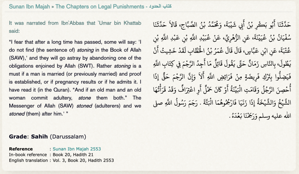 So if there was a supposed stoning verse, and so many individuals per the Hadith said they knew the verse by heart and were afraid that it was going to be lost for the ages, where can we find the actual statement?