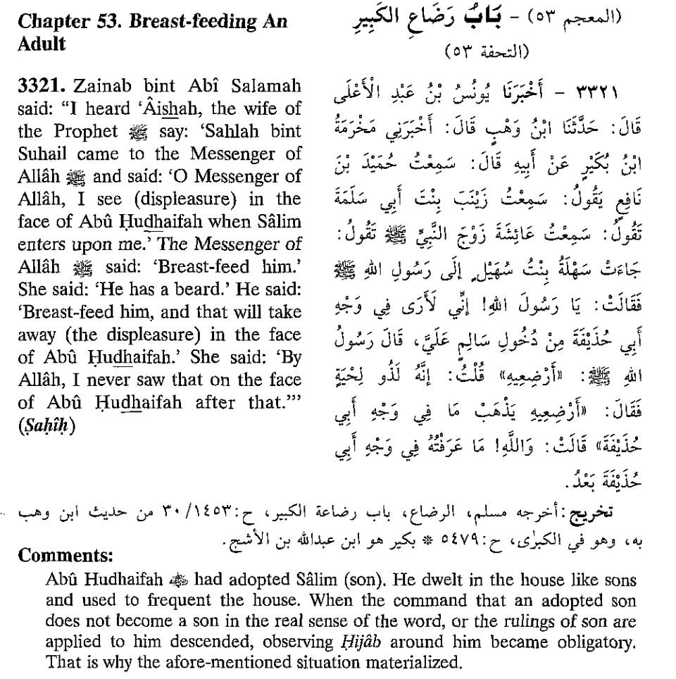 According to Hadith, the prophet encouraged grown men in certain situations to be breastfed by women to please their jealous husbands. They believed that once the man is breastfed by the woman, they will no longer have sexual desire for one another since they will be forbidden in marriage to one another.