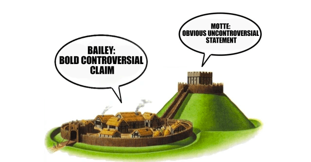 The motte-and-bailey fallacy (named after the motte-and-bailey castle) is a form of argument and an informal fallacy where an arguer conflates two positions that share similarities, one modest and easy to defend (the “motte”) and one much more controversial (the “bailey”). The arguer advances the controversial position, but when challenged, they insist that they are only advancing the more modest position. This allows an arguer to guard their indefensible position by only addressing their less egregious position when challenged.