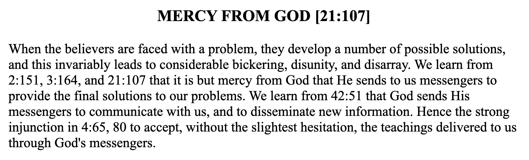 The work left by Rashad is not another source of religious law but provides a resolution to a number of the disputes that people have had regarding the verses of the Quran. This fulfills the function of a messenger without creating a contradiction in the Quran.