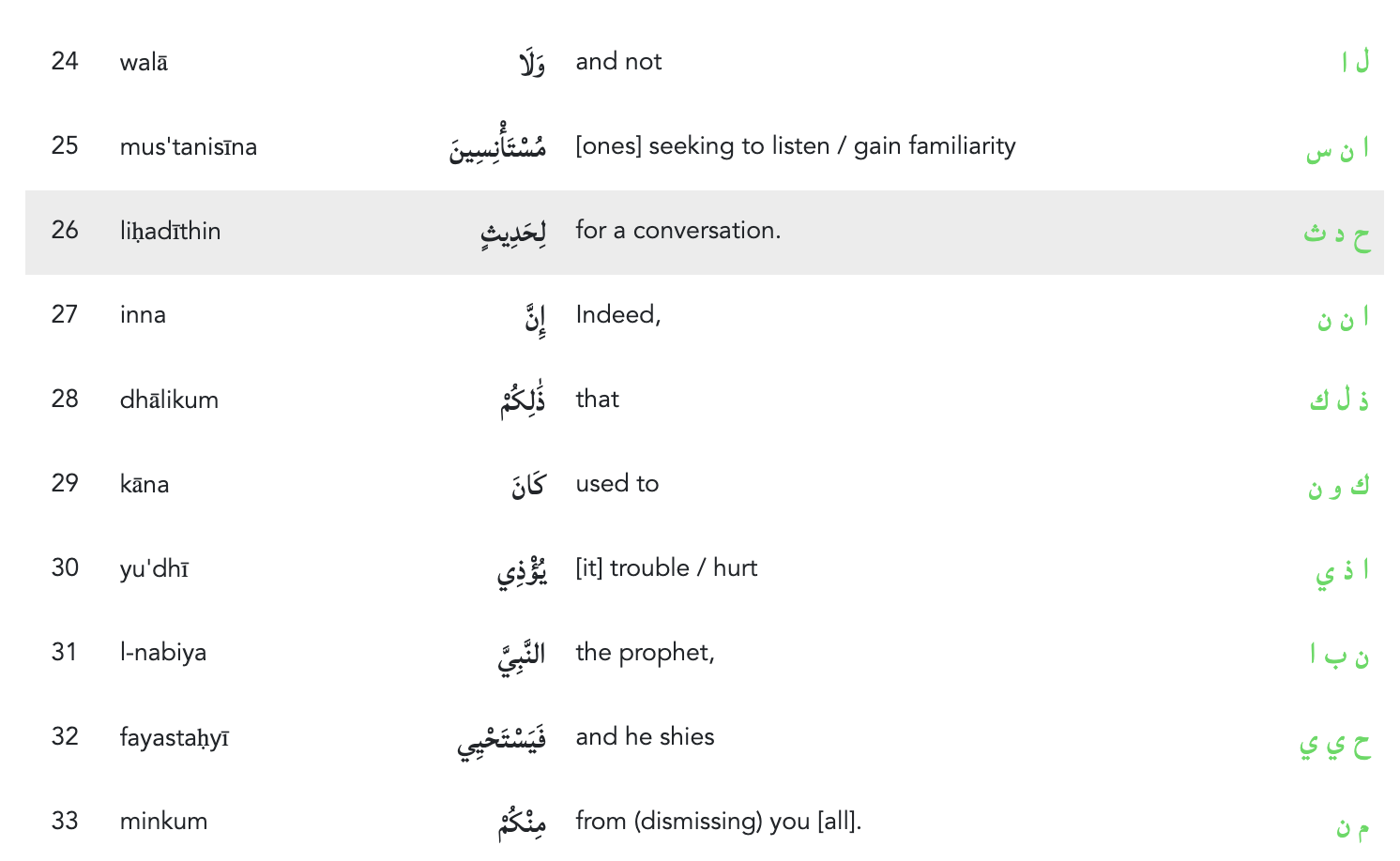 يَاأَيُّهَا الَّذِينَ آمَنُوا لَا تَدْخُلُوا بُيُوتَ النَّبِيِّ إِلَّا أَنْ يُؤْذَنَ لَكُمْ إِلَىٰ طَعَامٍ غَيْرَ نَاظِرِينَ إِنَاهُ وَلَٰكِنْ إِذَا دُعِيتُمْ فَادْخُلُوا فَإِذَا طَعِمْتُمْ فَانْتَشِرُوا وَلَا مُسْتَأْنِسِينَ لِحَدِيثٍ إِنَّ ذَٰلِكُمْ كَانَ يُؤْذِي النَّبِيَّ فَيَسْتَحْيِي مِنْكُمْ وَاللَّهُ لَا يَسْتَحْيِي مِنَ الْحَقِّ وَإِذَا سَأَلْتُمُوهُنَّ مَتَاعًا فَاسْأَلُوهُنَّ مِنْ وَرَاءِ حِجَابٍ ذَٰلِكُمْ أَطْهَرُ لِقُلُوبِكُمْ وَقُلُوبِهِنَّ وَمَا كَانَ لَكُمْ أَنْ تُؤْذُوا رَسُولَ اللَّهِ وَلَا أَنْ تَنْكِحُوا أَزْوَاجَهُ مِنْ بَعْدِهِ أَبَدًا إِنَّ ذَٰلِكُمْ كَانَ عِنْدَ اللَّهِ عَظِيمًا