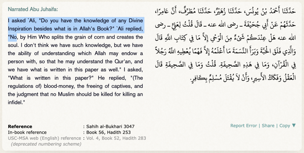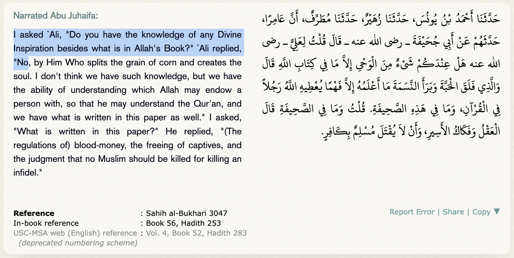 Additionally, it is clear that regardless of which of the two understandings is utilized that this statement attributed to the prophet’s companion Ali would have had to have been made after the prophet’s death. This would eliminate the possibility for some to claim that there were additional items that the prophet left irrespective of which understanding from above is used. But regardless of which understanding is taken, both narratives pose major problems for upholders of Hadith besides the Quran.