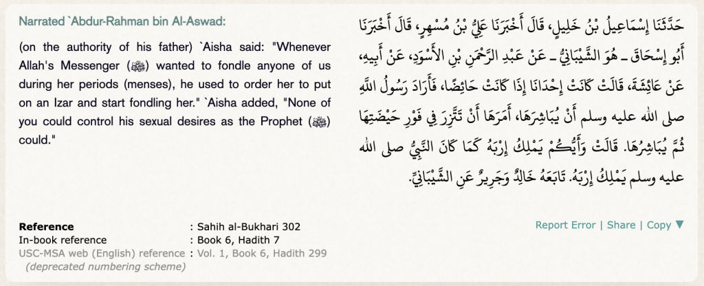 *Note: In Sahih al-Bukhari 2097, the translator distorted the translation in an attempt to hide the grossness of what is stated. In the Arabic, it states, “أَفَلاَ جَارِيَةً تُلاَعِبُهَا وَتُلاَعِبُكَ” the word جَارِيَةً (jariyatan) specifically about a “little girl” or “little slave girl” in this context. Additionally, we can see another narration of this Hadith from Sahih al-Bukhari 4052, as well as Book 8 Hadith 220 of “Bulugh al-Maram” or Muwatta Malik Book 30, Hadith 5.