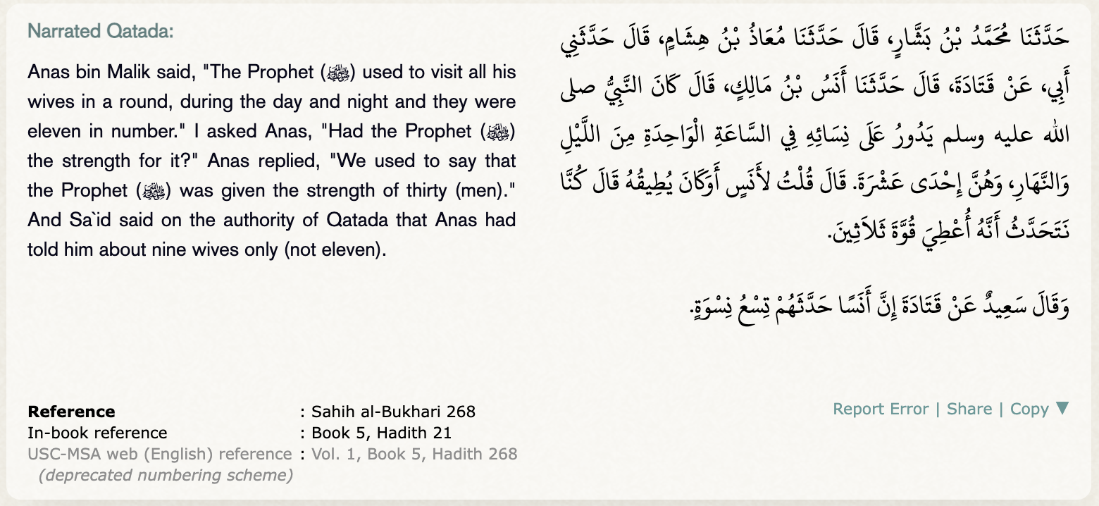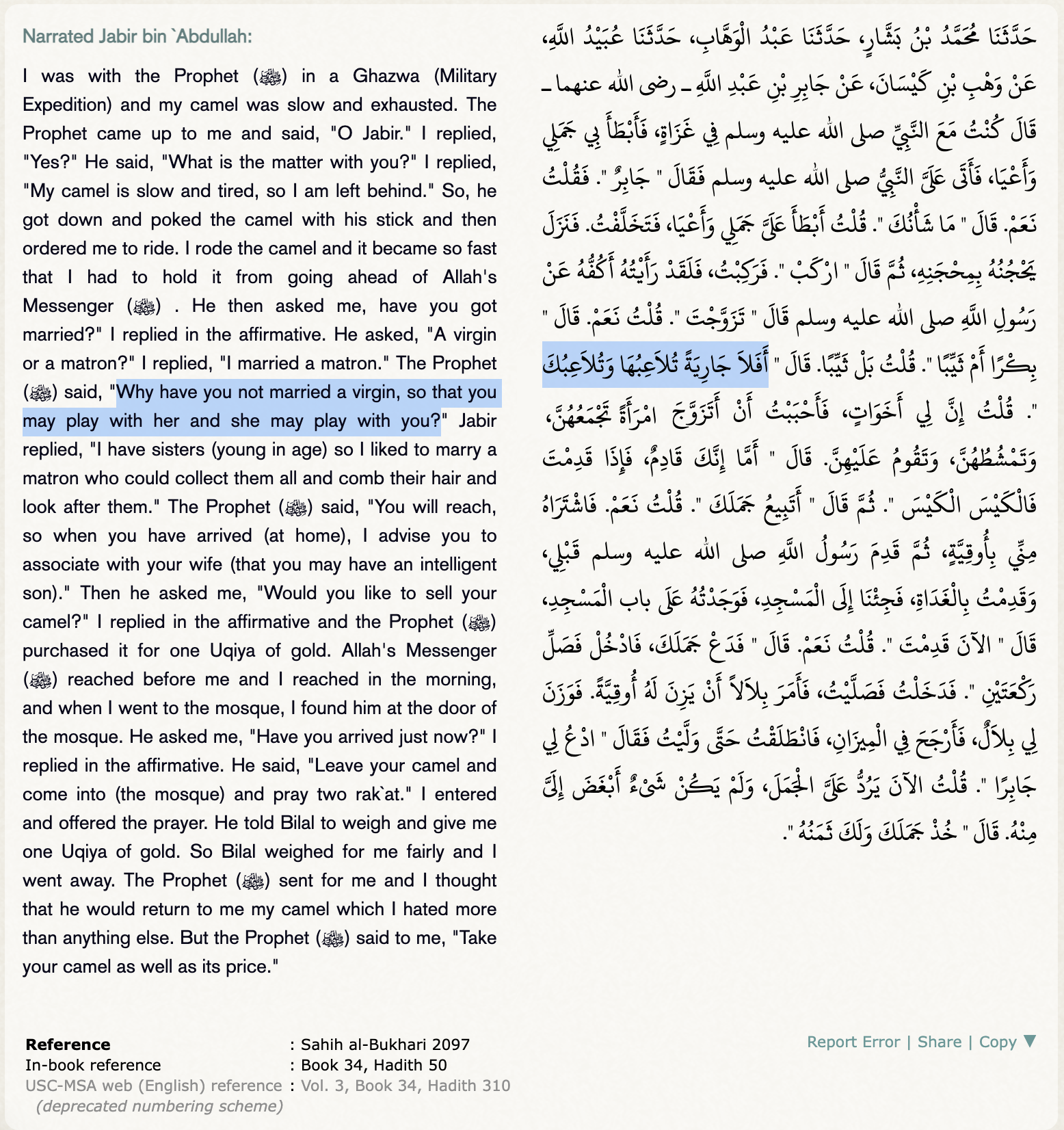 *Note: In Sahih al-Bukhari 2097, the translator distorted the translation in an attempt to hide the grossness of what is stated. In the Arabic, it states, “أَفَلاَ جَارِيَةً تُلاَعِبُهَا وَتُلاَعِبُكَ” the word جَارِيَةً (jariyatan) specifically about a “little girl” or “little slave girl” in this context. Additionally, we can see another narration of this Hadith from Sahih al-Bukhari 4052, as well as Book 8 Hadith 220 of “Bulugh al-Maram” or Muwatta Malik Book 30, Hadith 5.