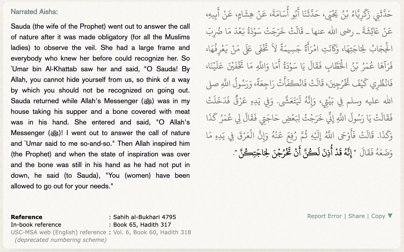 It is absolutely absurd to think that despite the repeated commandments in the Quran that the relationship between spouses is to be kept private, and that the people are to respect the privacy of the prophet and his wives, that such narratives would have been freely shared among the people by the prophet, his wives, and his companions. These are clearly fabrications of the worst kind.