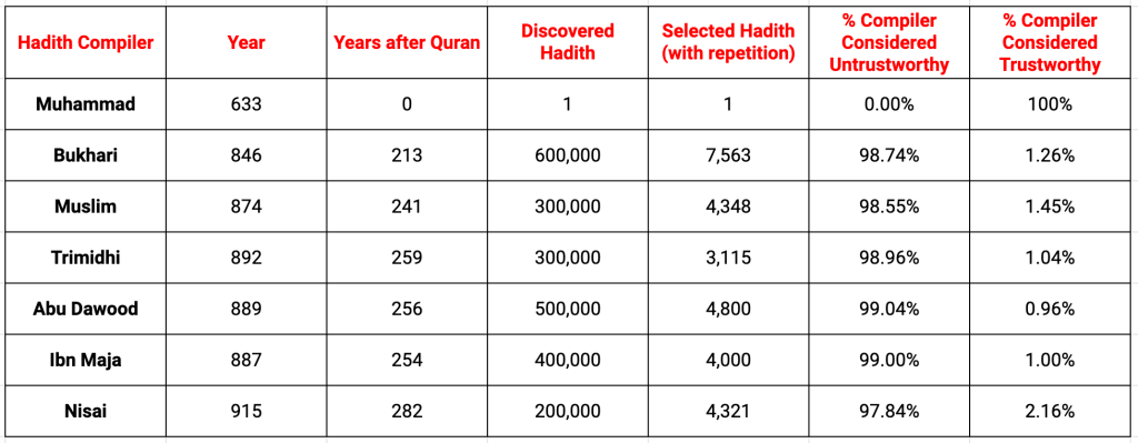 Now consider that the compilers of the Kutub al-Sittah, the six major hadith collections considered the most important among the different Sunni Madhhabs, each rejected nearly 99% of the Hadith they collected.