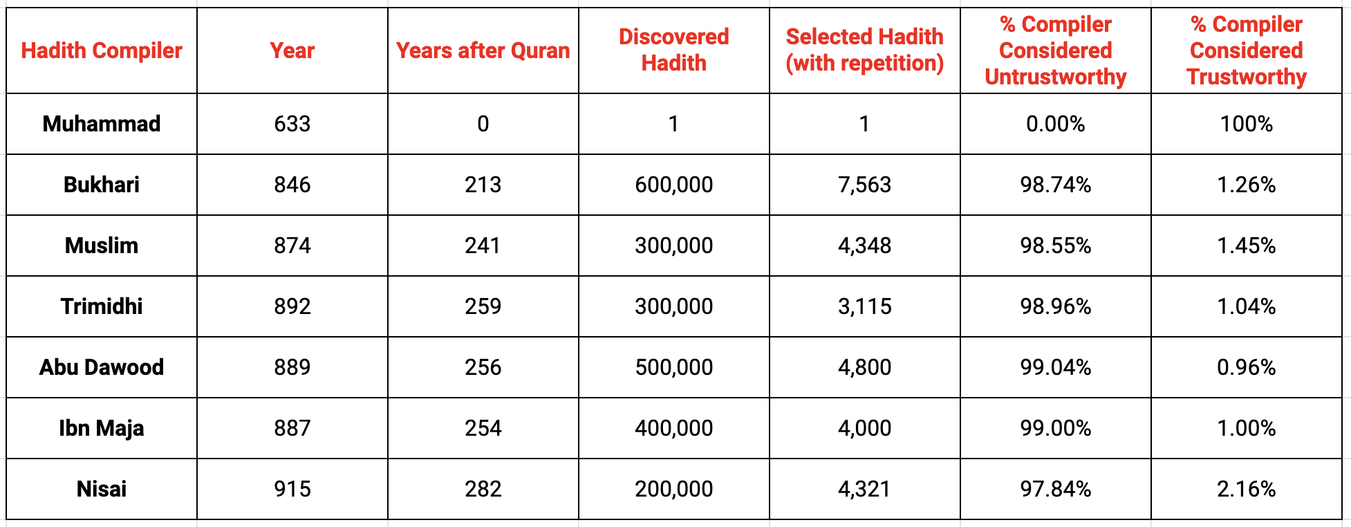 Now consider that the compilers of the Kutub al-Sittah, the six major hadith collections considered the most important among the different Sunni Madhhabs, each rejected nearly 99% of the Hadith they collected.