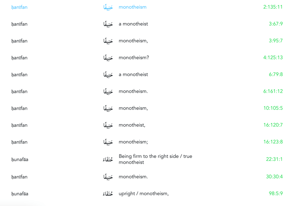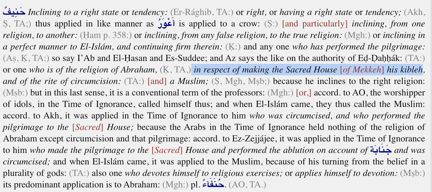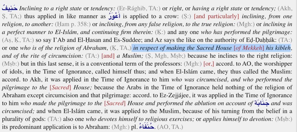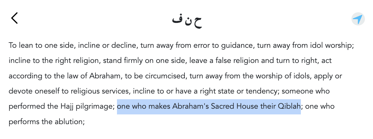 The word Hanif ( حَنِيفًا ), which is used to describe the name of the religion of Abraham, comes from the root ح ن ف and has the following derivative meanings, including “one who makes Abraham’s Sacred House their Qiblah.”