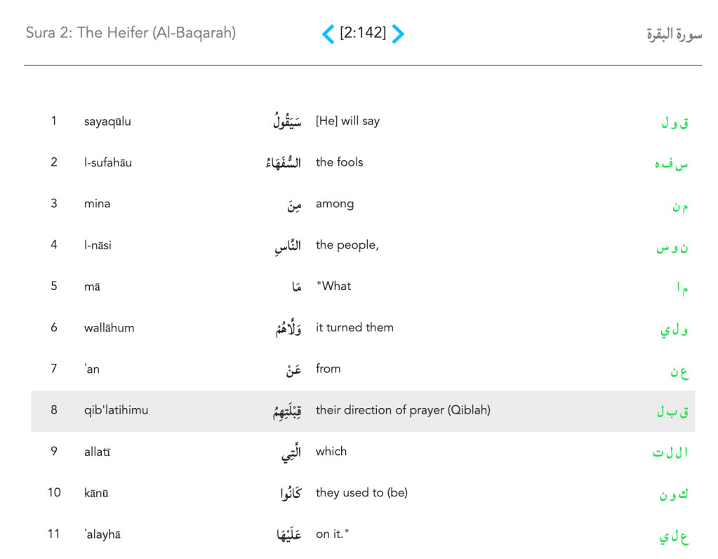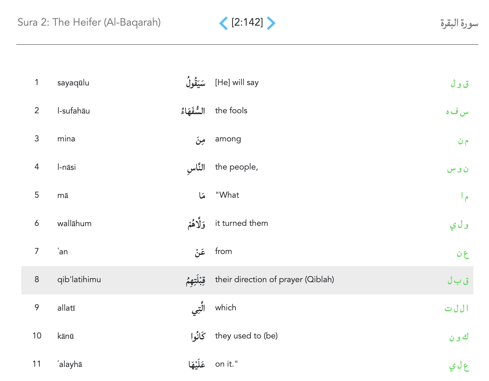 سَيَقُولُ السُّفَهَاءُ مِنَ النَّاسِ مَا وَلَّاهُمْ عَنْ قِبْلَتِهِمُ الَّتِي كَانُوا عَلَيْهَا قُلْ لِلَّهِ الْمَشْرِقُ وَالْمَغْرِبُ يَهْدِي مَنْ يَشَاءُ إِلَىٰ صِرَاطٍ مُسْتَقِيمٍ