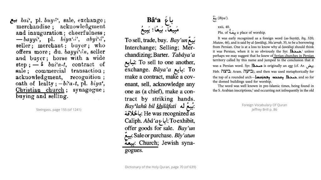 The word biyaʿun ( بِيَعٌ ) comes from the root ( ب ي ع ) and occurs 15 times in the Quran. In all other occurrences, this word is used in the context of trade, transaction, pledge, contract, or business. 22:40 is the only occurrence in the Quran where the root is used for the word church. The connection with the word “church” as used in 22:40 is believed to be of Syriac origin from the word ܒܝܥܬܐ • (bēʿṯā) f (plural ܒܝܥܬܐ (bēʿāṯā) or ܒܝܥܐ (bēʿē)) which means egg or arch in connection with the rounded structure of the Syrian churches in Persia called by this name.