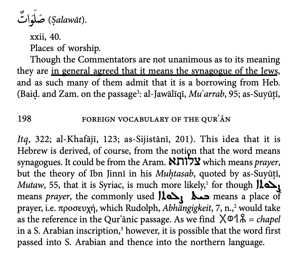 The word ṣalawātun ( صَلَوَاتٌ ) comes from the root ( و ص ل ), which means to connect or join. The term synagogue comes from the Greek words sun and agó, which forms the word sunagógé ( συναγωγή ), and means “to bring together” and is understood as a “place of assembly.” Therefore a ṣalawātun ( صَلَوَاتٌ ) in the context of a place would be best translated as a synagogue, a place where people connect, join, or assemble for worship.