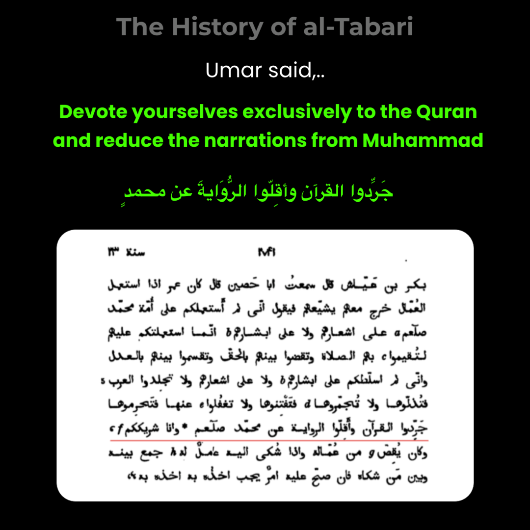 This again emphasizes Umar’s devotion to people following the Quran alone during his reign after the prophet’s death. This shows that Umar advocated for the Quran alone and against the dissemination of Hadith. Ironically, if someone made this statement today, they would be called a heretic by the Muslim masses.