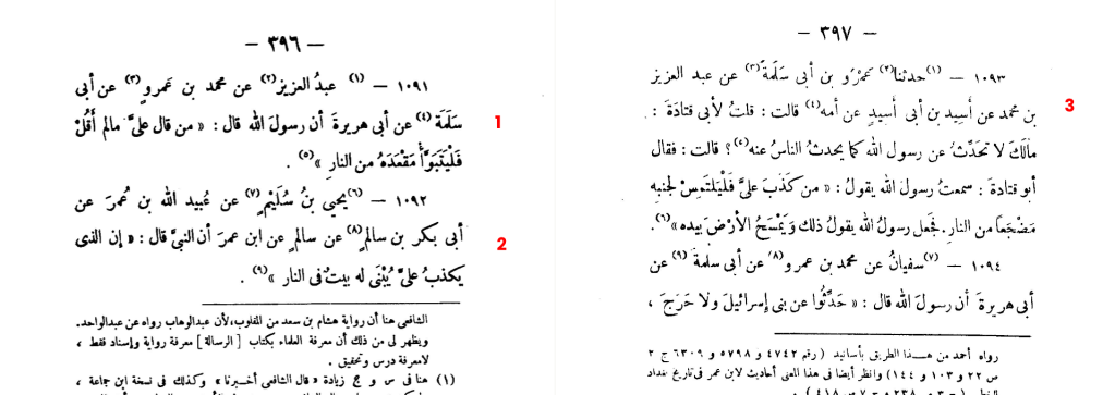 2/ Yahya ibn Sulaym, from ‘Ubaydallah ibn ‘Umar, from Abu Bakr ibn Salim, from Salim, from Salim, from Ibn ‘Umar, that the prophet said, “Whoever lies about me has a home built for him in Hell.“