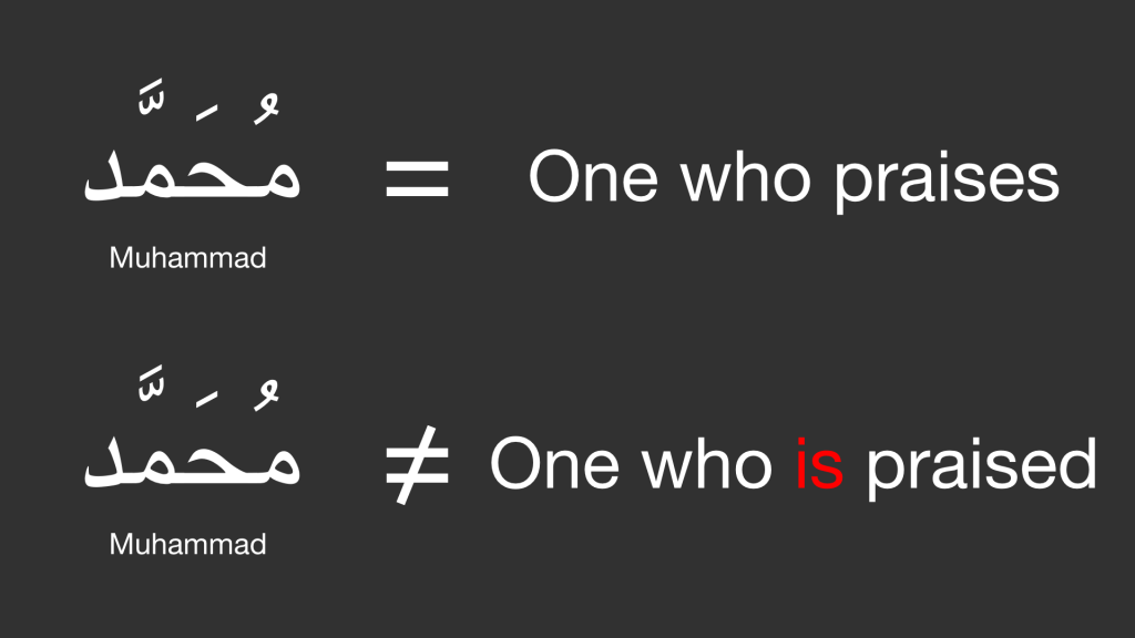 Based on the logic stated above, one would translate Muhammad as “one who praises, ” yet most Muslims translate this name as “one who is praised,” thus changing the focus of the praise from one who praises God to one who is praised.