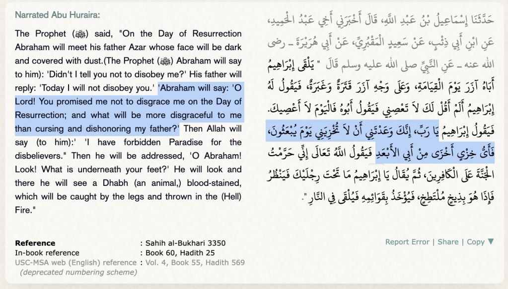 Narrated Abu Huraira: The Prophet (ﷺ) said, “On the Day of Resurrection, Abraham will meet his father Azar whose face will be dark and covered with dust. (The Prophet (ﷺ) Abraham will say to him): ‘Didn’t I tell you not to disobey me?’ His father will reply: ‘Today, I will not disobey you.’ ‘Abraham will say: ‘O Lord! You promised me not to disgrace me on the Day of Resurrection, and what will be more disgraceful to me than cursing and dishonoring my father?’ Then Allah will say (to him): ‘ ‘I have forbidden Paradise for the disbelievers.” Then he will be addressed, ‘O Abraham! Look! What is underneath your feet?’ He will look, and there he will see a Dhabh (an animal) blood-stained, which will be caught by the legs and thrown in the (Hell) Fire.”