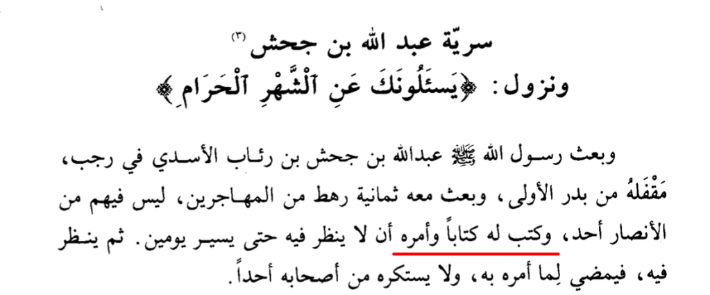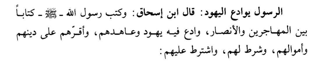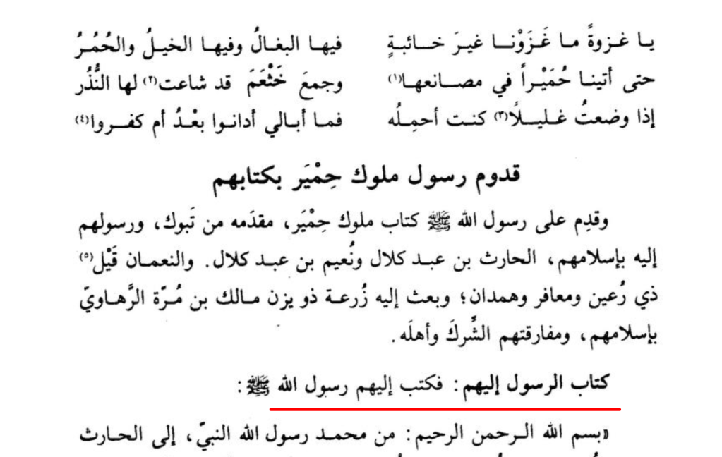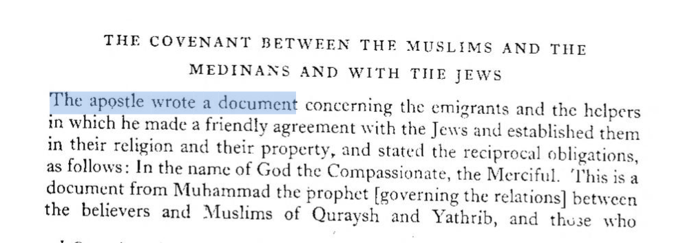 Additionally, it is strange that in this comprehensive history of the life of the prophet, Ibn Ishaq never mentions once that the prophet was illiterate! Not only that, but three times he explicitly states that the prophet wrote. Once regarding the Constitution of Medina (p. 231), another time regarding a letter he gave one of the companions in preparation for the Battle of Badr (p. 286), and the third time regarding a letter the prophet wrote to the kings of Himyar (p. 643).