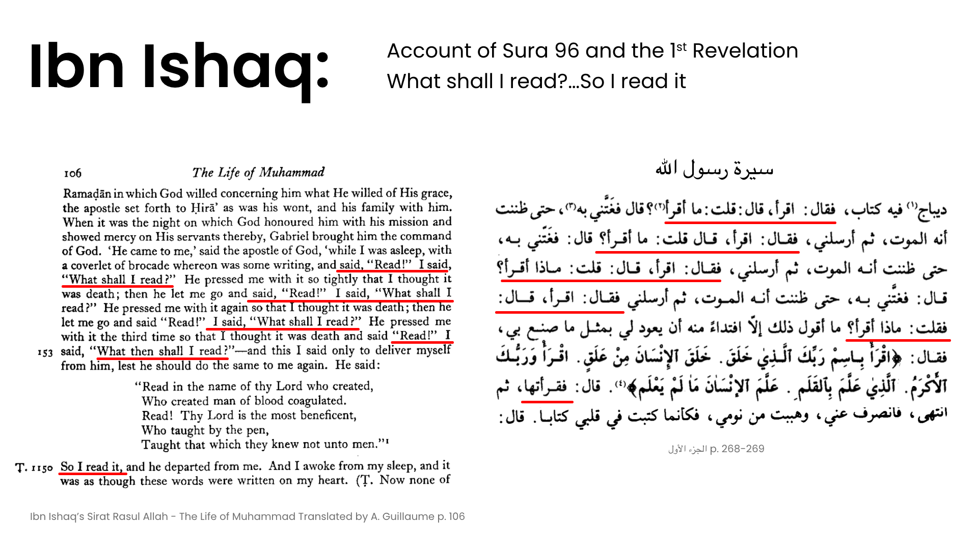 In this book, Ibn Ishaq narrates the same story regarding the prophet’s supposed receiving of the first revelation, except there are a couple major differences. It is worth noting that Tabari also cites this narration from Ibn Ishaq.