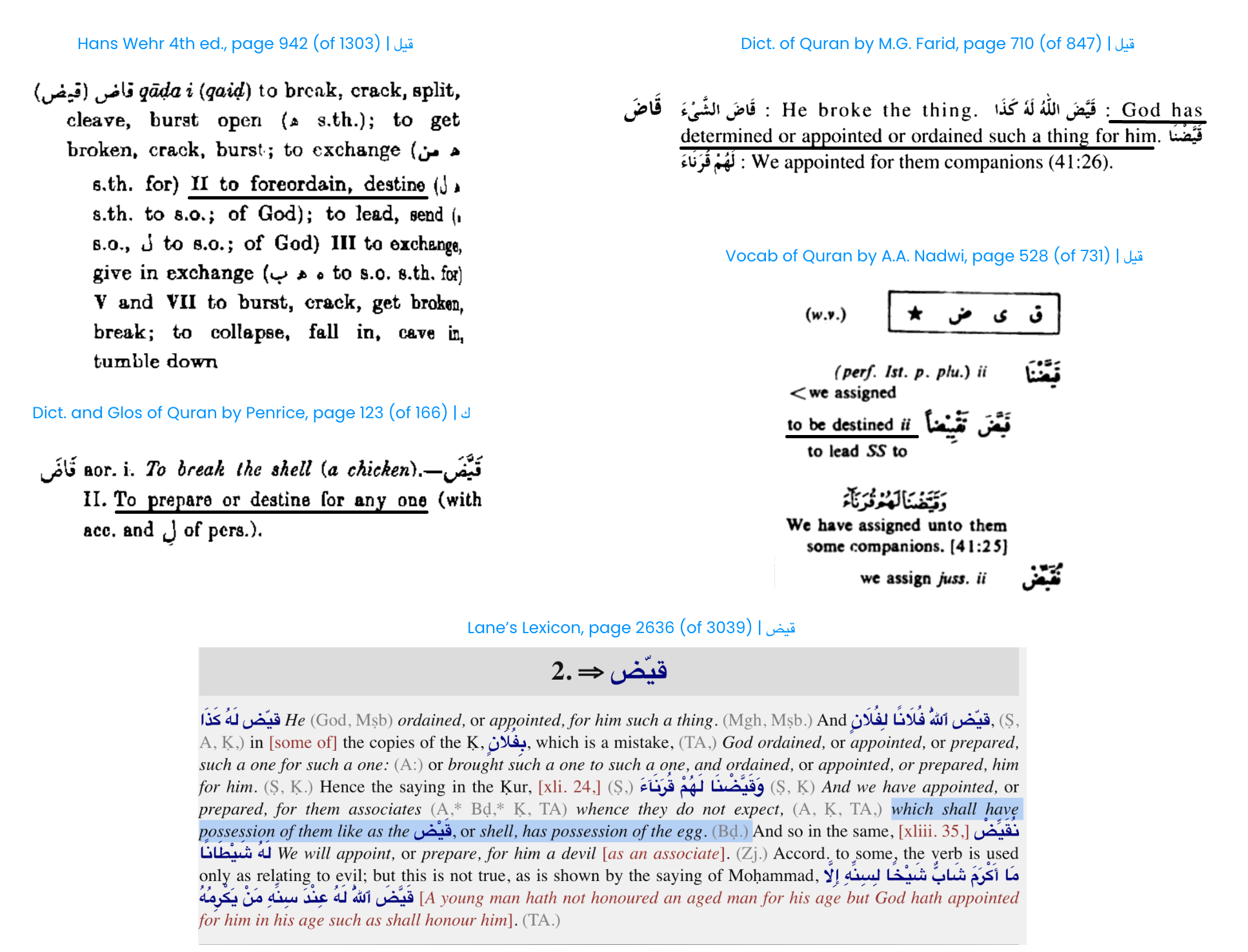 Incredibly, the parallels between this root for the word appoint, and the human relationship with the Jinn companion are jaw-dropping. The root meaning is associated with an egg, symbolizing how the Jinn and Human are interlinked from birth. The root also means to stick to something and contain or overpower it like an eggshell does to the egg, which also ties in with how the Human body is the shell by which the Jinn Companion is contained. Lastly, the meaning of being assigned in the sense of something being prepared beforehand, destined and foreordained also shows that God did not appoint the Companion after the fact, but He predetermined which Companion would be foreordained for which corresponding human. Again, this shows that the Companion is part of the human from the start and not an entity assigned later in life if one goes astray. God already knows who is destined to go astray and who is destined to be guided and has preordained which companions will be with which individuals.