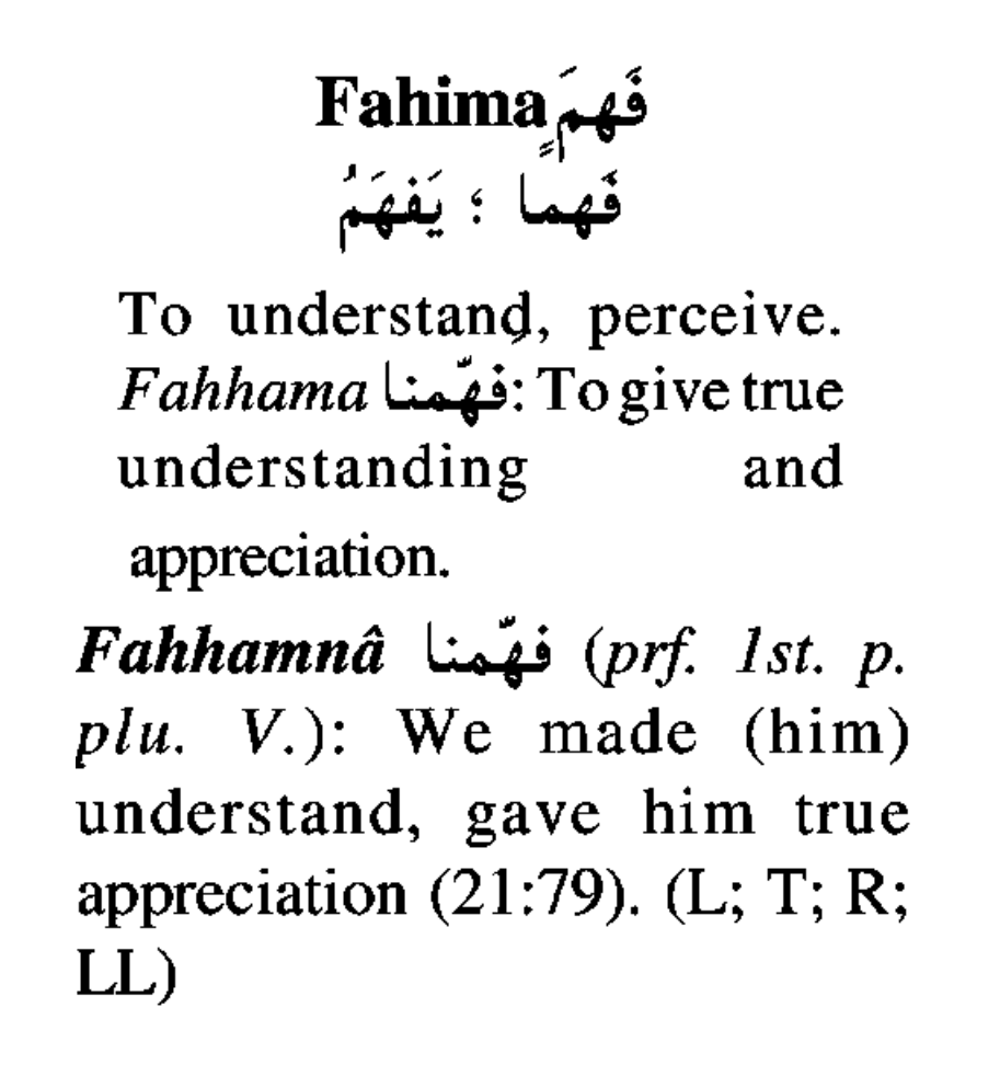 The word for this “correct understanding” in Arabic is fafahhamnāhā ( فَفَهَّمْنَـٰهَا ). This word is different than the other words used in the Quran that denote “understanding” such as “aql” ( عقل ), “albāb” ( ألبـب ), “fqah” ( فقه ), or “ḥiṭ” ( حط ). The word fafahhamnāhā ( فَفَهَّمْنَـٰهَا ) comes from the root “fa-ha-mim” ( ف ه م ) and is the only occurrence of this root in the entire Quran. In most Classical Arabic dictionaries, it typically defines this root as simply “to understand,” but the “Dictionary of the Holy Quran” gives a little more depth to the possible meaning of this word. This source states that this word means, “to give true understanding and appreication.“