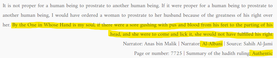It is not proper for a human being to prostrate to another human being. If it were proper for a human being to prostrate to another human being, I would have ordered a woman to prostrate to her husband because of the greatness of his right over her. By the One in Whose Hand is my soul, if there were a sore gushing with pus and blood from his feet to the parting of his head, and she were to come and lick it, she would not have fulfilled his right.