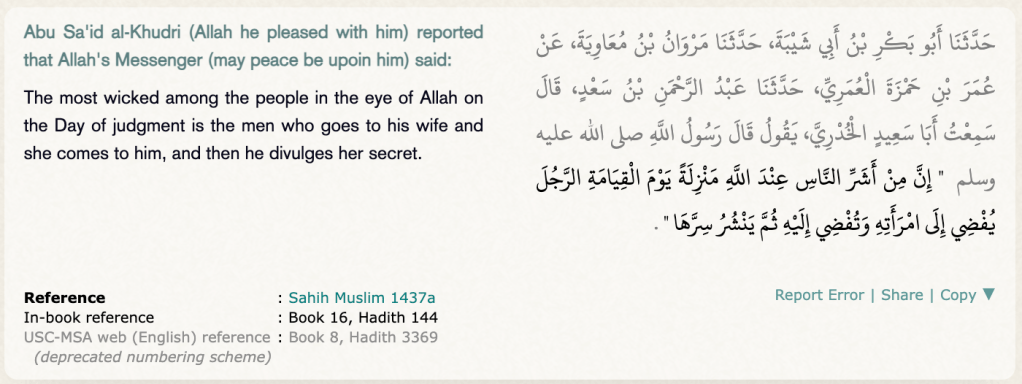 The Quran informs us that the sexual relations between a husband and a wife are to be kept private.