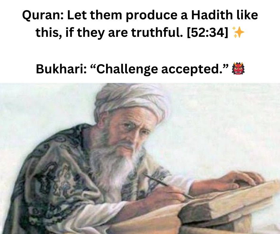 When traditionalists are asked if humans and jinns can produce Hadith like the Quran, they start to squirm. This is because they believe that humans not only could, but they did create Hadith like the Quran. Not only do they have many volumes of books of Hadith besides the Quran, but they often even uphold their man-made Hadith over the words of God in the Quran.