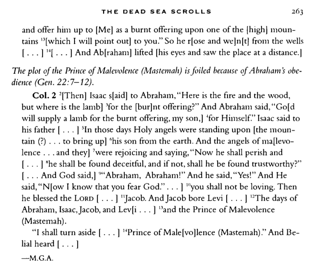 And I stood before him, and before the prince Mastêmâ, and the Lord said, ‘Bid him not to lay his hand on the lad, nor to do anything to him, for I have shown that he fears the Lord.’ And I called to him from heaven, and said unto him: ‘Abraham, Abraham;’ and he was terrified and said: ‘Behold, (here) am I.’ And I said unto him: ‘Lay not thy hand upon the lad, neither do thou anything to him; for now I have shown that thou fearest the Lord, and hast not withheld thy son, thy first-born son, from me.’ And the prince Mastêmâ was put to shame; and Abraham lifted up his eyes and looked, and, behold a ram caught . . . by his horns, and Abraham went and took the ram and offered it for a burnt-offering in the stead of his son. – Jubilees 18:9-12