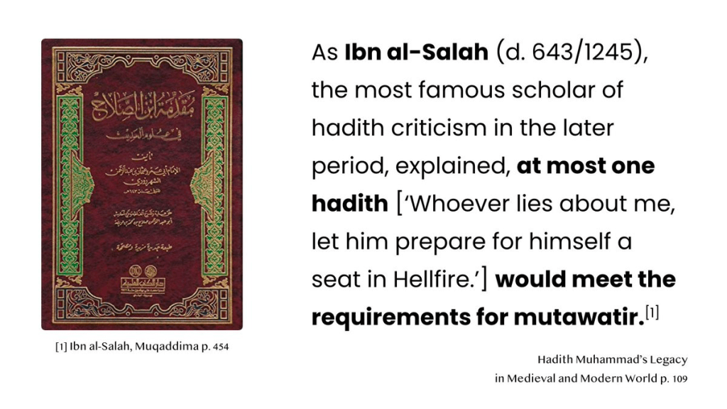 The categories of mutawatir and had were similarly unsuitable for the hadith tradition, for essentially all hadiths were ahad. As Ibn al-Salah (d. 643/1245), the most famous scholar of hadith criticism in the later period, explained, at most one hadith (‘Whoever lies about me, let him prepare for himself a seat in Hellfire.’) would meet the requirements for mutawatir.[1] No hadiths could actually be described as being narrated by a large number of narrators at every stage of their transmission. In fact, when Mu’tazilites had insisted that hadiths be transmitted by a mere two people at every stage, the Sunni Ibn Hibban had accused them of trying to destroy the Sunna of the prophet in its entirety.[2]