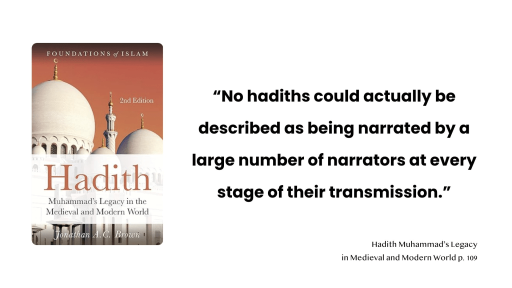 “The Companion Wathila b. Asqa‘ had admitted that sometimes the early Muslims even confused the exact wording of the Quran, which was universally well-known and well-preserved. So how, he asked, could one expect any less in the case of a report that the Prophet had said just once? Al-Hasan al-Basri is reported to have said, If we only narrated to you what we could repeat word for word, we would only narrate two hadiths.”
