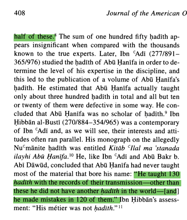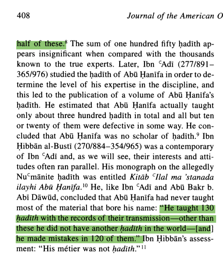 A fascinating parallel can be found in the work of Ibn Hibbān. In the notice on Abū Hanı̄fa in Kitābal-Majrūhı̄n, Ibn Hibbān writes: